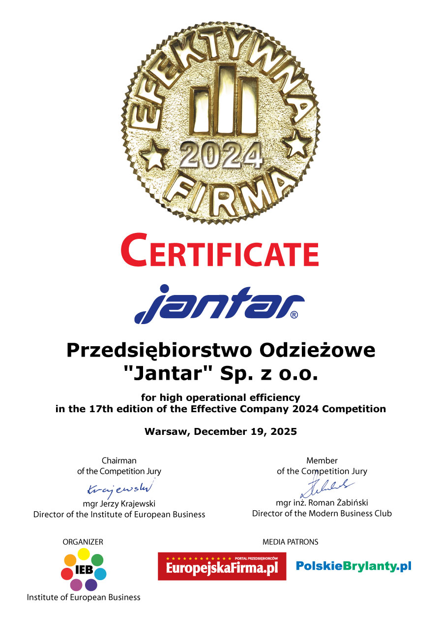 Przedsiębiorstwo Odzieżowe Jantar Sp. z o.o. w Wejherowie została wyróżniona przez Instytut Europejskiego Biznesu w XIX edycji Konkursu Gepardy Biznesu 2024, XVII edycji Konkursu Efektywna Firma 2024 i XII edycji Programu Promocyjnego Mocna Firma Godna Zaufania 2024 na odstawie danych finansowych.